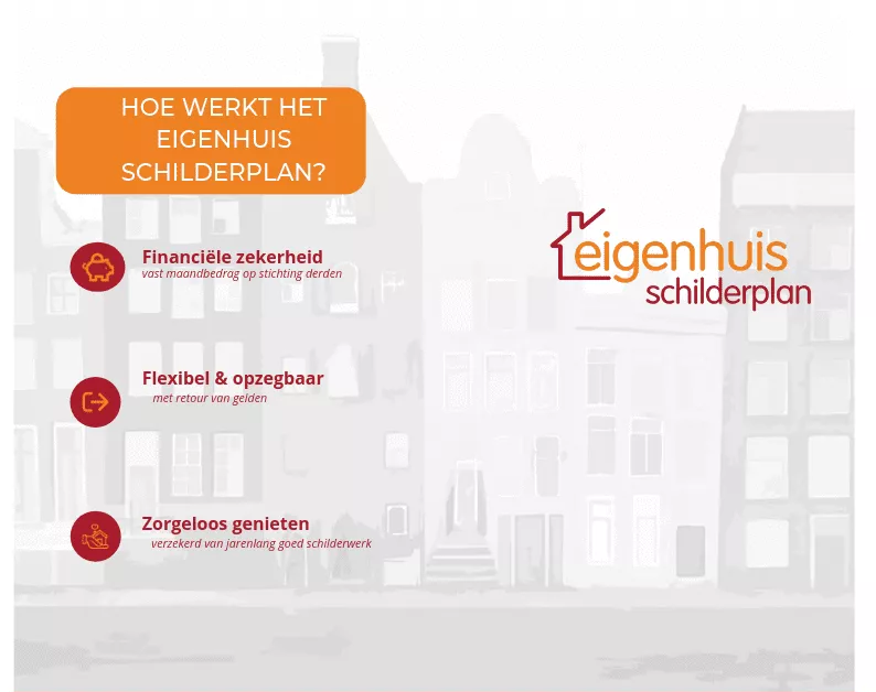 Eigenhuis Schilderplan start met een volledige schilderbeurt, de nulbeurt. Die u betaalt nadat deze is uitgevoerd. Daarna start het schilderabonnement van Eigenhuis Schilderplan. Hiermee weet u jarenlang waar u financieel aan toe bent op het gebied van schilderwerk. Met een vast maandbedrag komt u niet voor vervelende verrassingen te staan. Zelfs inflatie is er in opgenomen; met vast bedoelen we ook echt vast! Weet u nu al wat een schilderbeurt over zes jaar gaat kosten? Met een schilderabonnement weet u zeker dat u de komende jaren nog net zoveel per maand betaalt als vorige maand. Deze samenvatting laat u precies zien hoe het werkt.