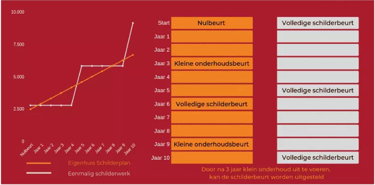 Eigenhuis Schilderplan start met een volledige schilderbeurt, de nulbeurt. Die u betaalt nadat deze is uitgevoerd. Daarna start het onderhoud van Eigenhuis Schilderplan . Hiermee weet u jarenlang waar u financieel aan toe bent op het gebied van schilderwerk. Met een vast maandbedrag komt u niet voor vervelende verrassingen te staan. Zelfs inflatie is er in opgenomen; met vast bedoelen we ook echt vast! Weet u nu al wat een schilderbeurt over zes jaar gaat kosten? Met een schilderabonnement weet u zeker dat u de komende jaren nog net zoveel per maand betaalt als vorige maand. Deze samenvatting laat u precies zien hoe het werkt.